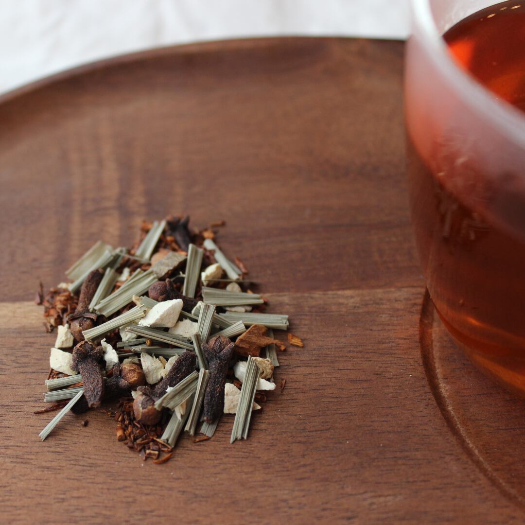 発酵させ紅茶のような風味のルイボスレッドをベースに、からだを末端まで温めるジンジャー、シナモン、クローブ、消化を促進するレモングラスをブレンド。